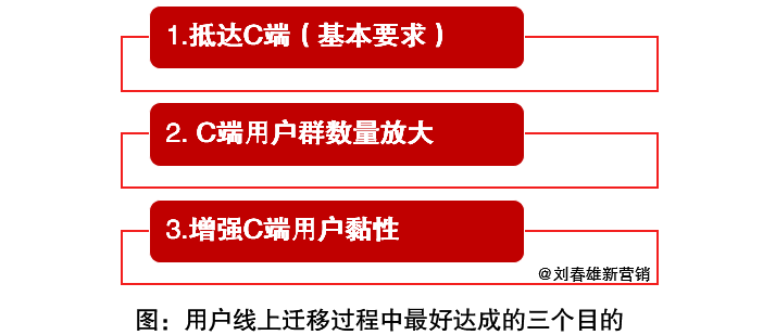 在用户往线上迁移过程中,最好能达成三个目的:一是抵达C端,这是基本要求,传统渠道只是触达B端;二是C端用户群数量放大;三是增强C端用户黏性。