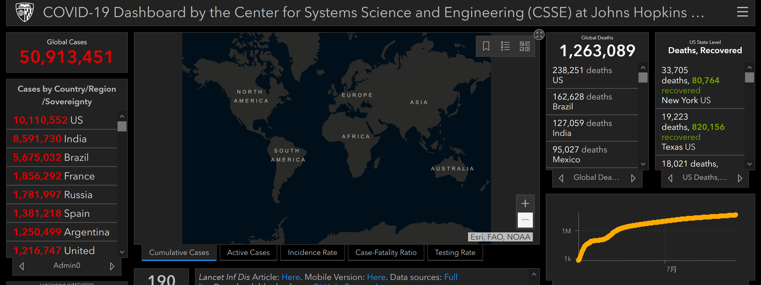 病毒式增长模型本身来源于医学的概念,可以拿今年约翰霍普金斯大学为新冠疫情做的统计数据图举个例子: